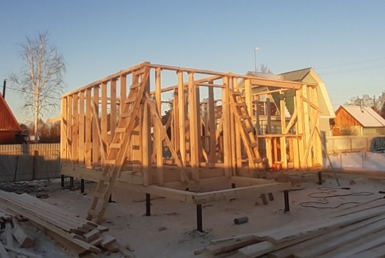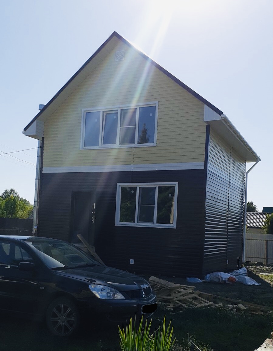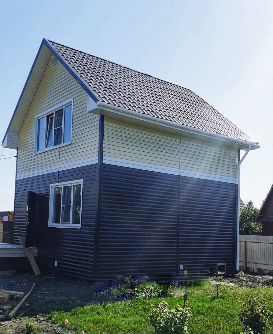 Стены: деревянный каркас с утеплением 200 мм, фасад – металлосайдинг "Карабельная доска" верх RAL 1014, низ RAL 8017