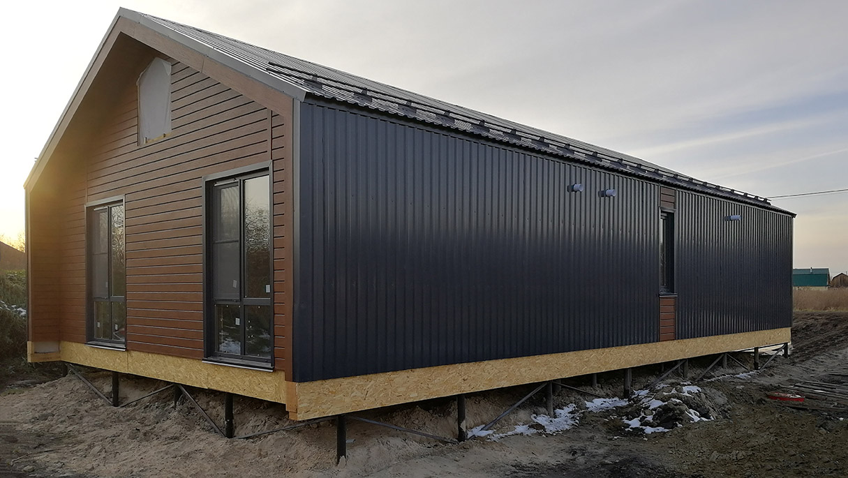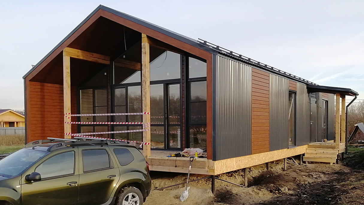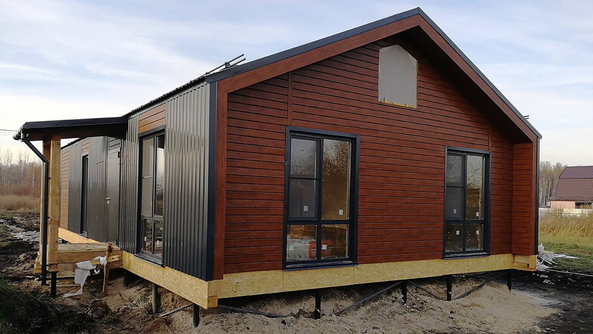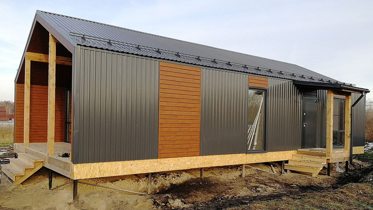 Фасад: сайдинг софит дуб, профнастил С-20 RAL 7024
