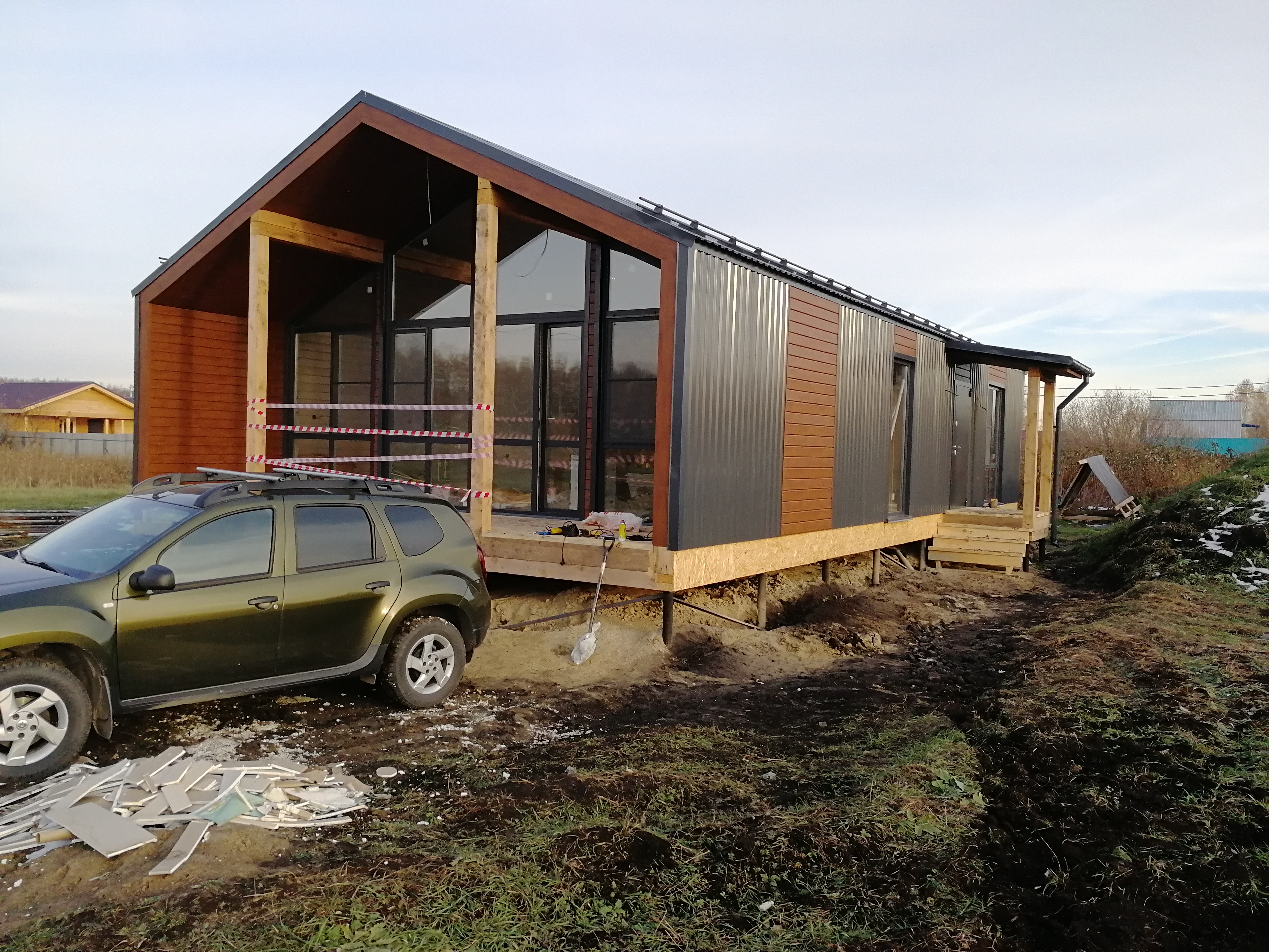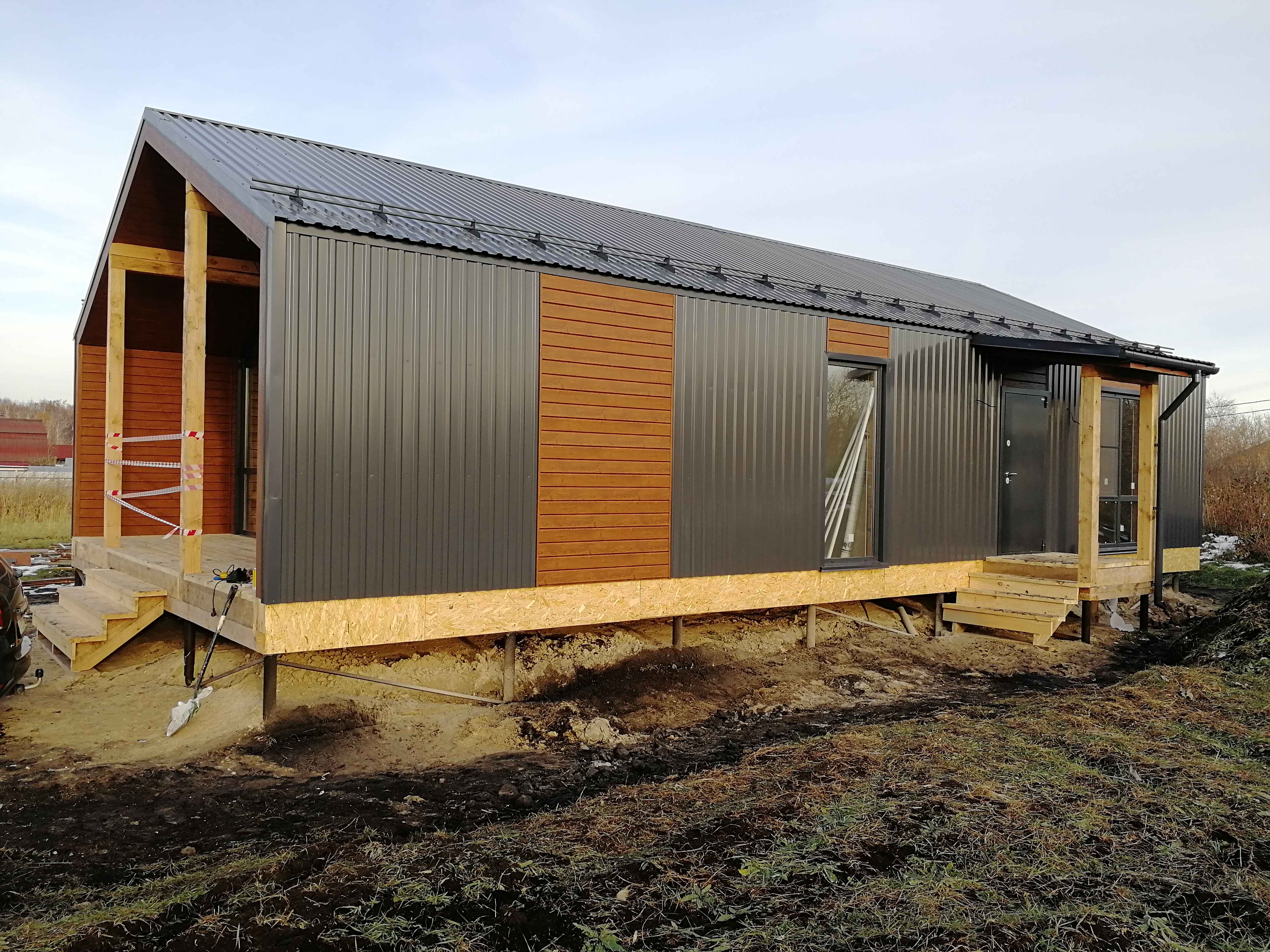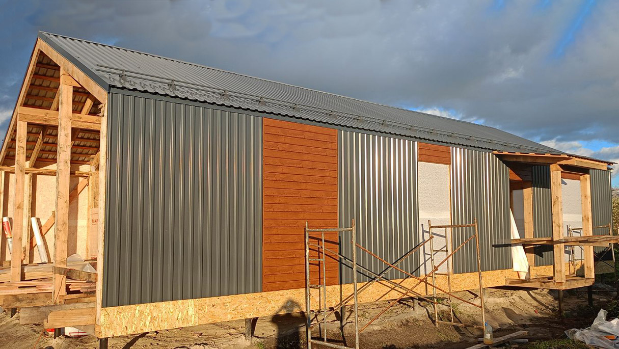 Фасад: сайдинг софит дуб, профнастил С-20 RAL 7024