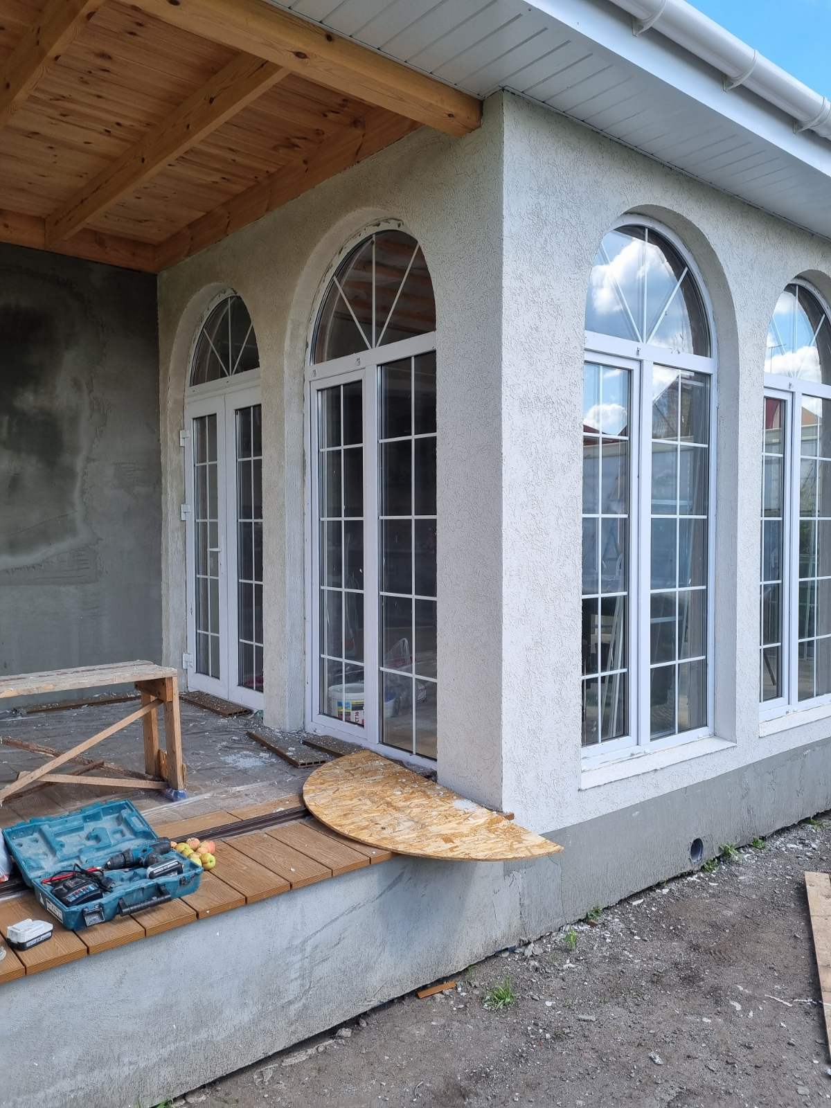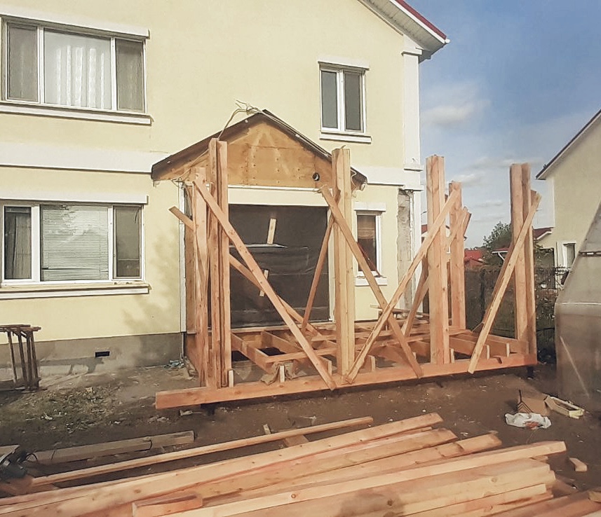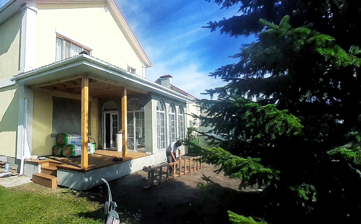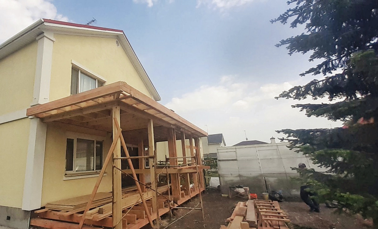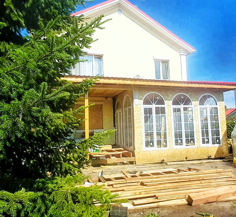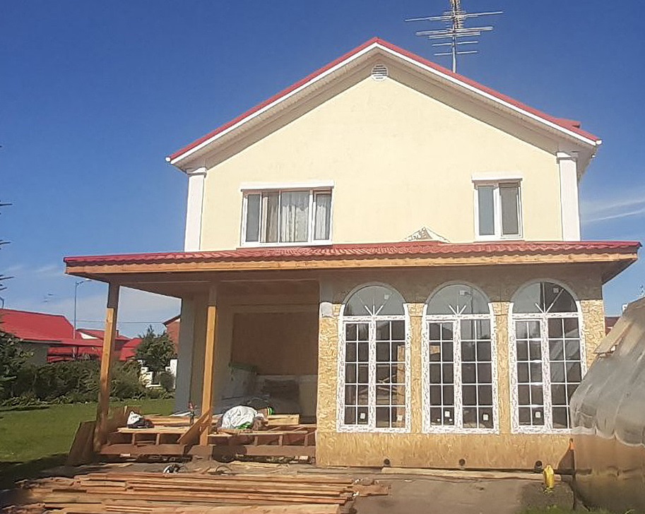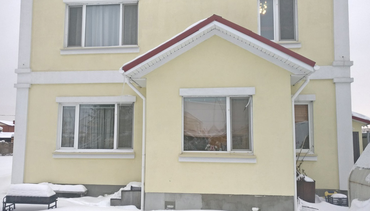Стены: деревянный каркас с утеплением 200 мм, фасад – декоративная штукатурка короед СТ35
